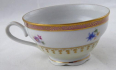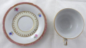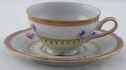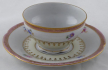 White, coloured and gilded porcelain. Bowl-shaped cup with ring. Cup and saucer decorated with gold lines, upper pink rim with gilt ornament. Central band with coloured flowers. At the bottom a golden wreath on a light yellow glaze. Unmarked. Europe 1900 - 1930. Height 4 cm, diameter of saucer 12 cm.
