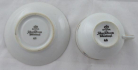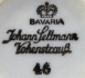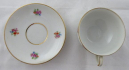 White porcelain with creamy glaze and golden lines. Bowl-shaped cup. Decorated with colourful small flowers with leaves. Marked from the bottom : black printed Bavaria Johann Seltmann Vohenstrauss crown, number 46. Porzellanfabrik Johann Seltmann, Vohenstrauss, Bavaria, Germany 1949 - 1955. Height 11 cm, diameter of saucer 4,5 cm.