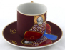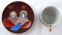 White, painted and gilded porcelain. Decorated on a brown ground with a coloured, gilded, embossed motif of an old man and a young girl in Chinese or Japanese style. Inside the cup, a lithophane, with a girl’s head. Unmarked. East Asia, last century. Height of cup 5,5 cm, diameter of saucer 11 cm.