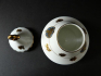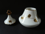 White porcelain, painted, gilded, glazed. Removable conical lid with a gilded three-leaf handle. Box pagoda-shaped with gilded flowers, line, medallions with vase and flowers. Marked from below - Neu Rohlau, Czechoslovakia from 1921 to 1945. Height 10.5 cm.
