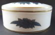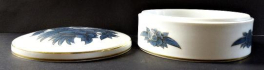 White, blue and gilded porcelain. Period and style art deco. Round shape. Flat, slightly arched lid. Decorated with a stylized blue lion, with mane, wings, flowers and gilded contours. The lower part of the jar decorated around the perimeter with flowers and leaves. Gilded lines. Rosenthal, Germany 1921 - 1922. Diameter 14 cm.