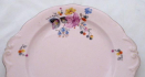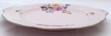 Colourful pink porcelain. Round shallow shape. Embossed side handles decorated with silver contours. Plate decorated with multicoloured printed flowers and silver line. Marked from below : Importeé de Tchecoslovaque. Czechoslovakia 1920-1940. Diameter 29 cm.