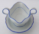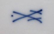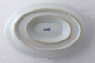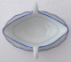 White, painted and gilded porcelain. Deep bowl for sauce in the shape of a shell, with side arched handles - finished with embossed leaves. Firmly connected, with the lower oval plate. Decorated with blue lines, gilded line ( at the upper edge ) . Marked from below: blue crossed swords with a dot at the top, embossed numbers. Meissen, Germany 1924 - 1934. Height 9.5 cm, width 27 cm.