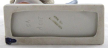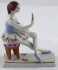 White, colored, painted and gilded porcelain. Statuette of a ballerina sitting on a stool. Dressed in a blue bodice with lace skirt. In one hand she holds a golden oval mirror, with the other hand she holds her hair. Lace skirt damaged in places, decorated with glass beads. Royal Dux, Duchcov, Czechoslovakia 1920 - 1980. Height 12 cm, width 9,5 cm.