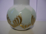 The lower portion of a spherical shape, with a long narrow tapering throat. The bottom part in relief decorated with lotus flower greenish gold-painted applications. Marked green underglaze. White porcelain, painted and glazed. White throat. After 1957. Height 17 cm.